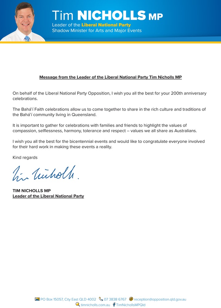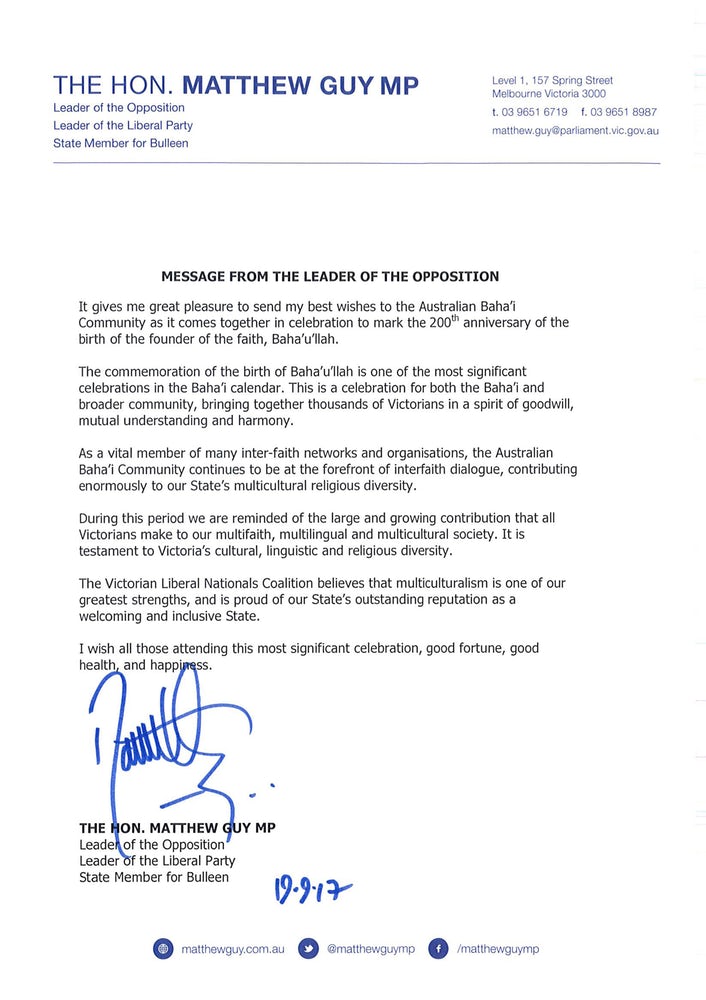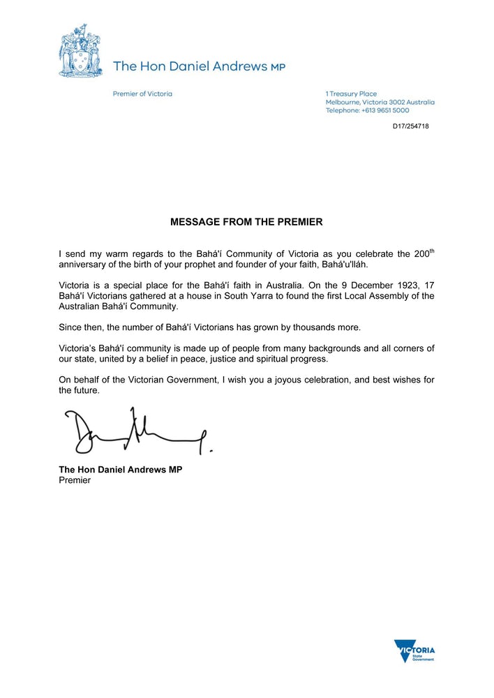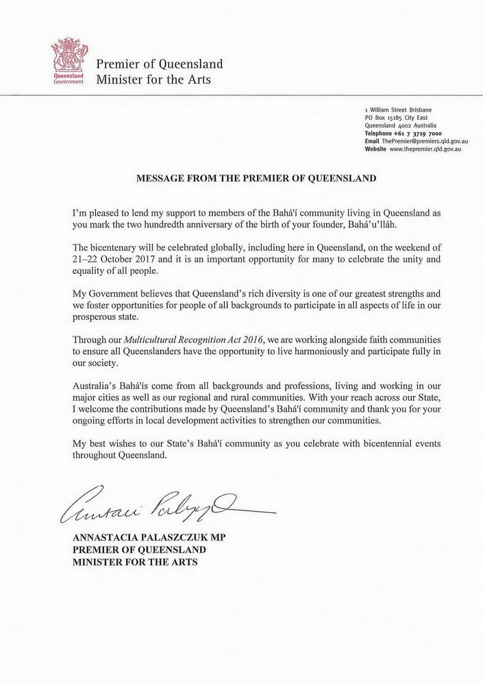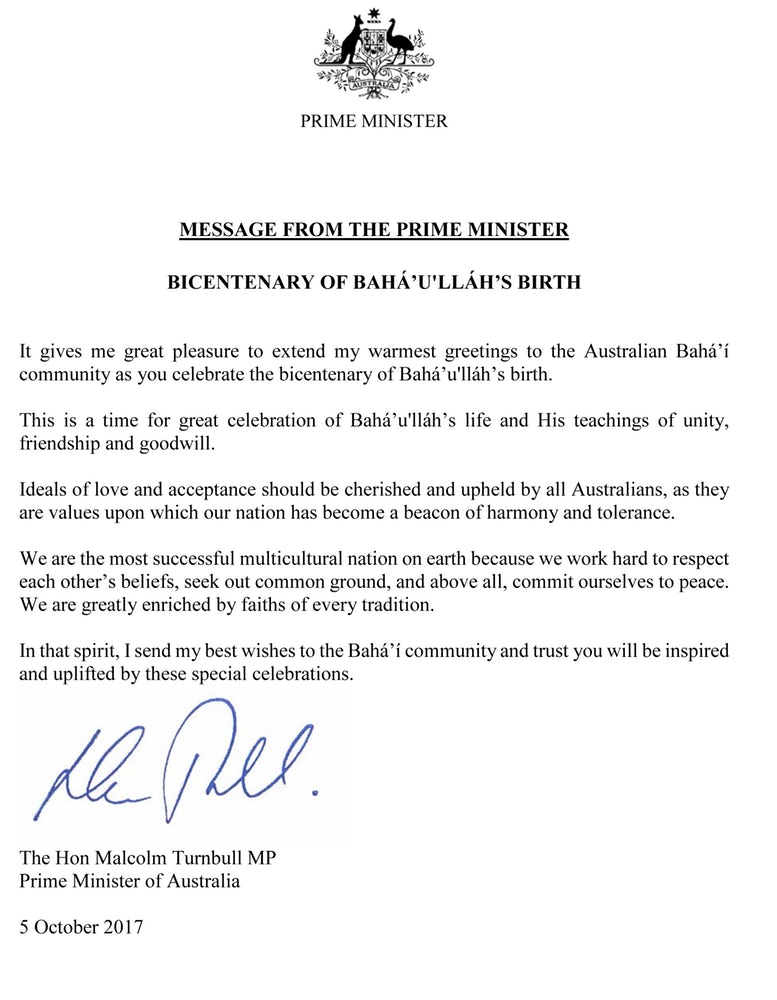 « Le moment est venu d’une grande célébration de la vie de Bahá’u’lláh et de ses enseignements d’unité, d’amitié et de bienveillance, a écrit le Premier ministre Turnbull. Les concepts d’amour et d’acceptation doivent être chéris et soutenus par tous les Australiens, car ils sont des valeurs sur lesquelles notre nation est devenue un modèle d’harmonie et de tolérance. »