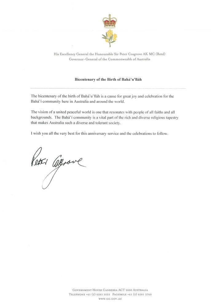 Parmi les sentiments exprimés par ces nombreux leaders en Australie, il y a l’appréciation de la façon dont la communauté bahá’íe a contribué à l’harmonie sociale. « La communauté bahá’íe est une composante essentielle de la mosaïque religieuse, riche et diversifiée, qui fait de l’Australie une société aussi diversifiée et tolérante », a écrit le gouverneur général Peter Cosgrove dans un message aux bahá’ís.