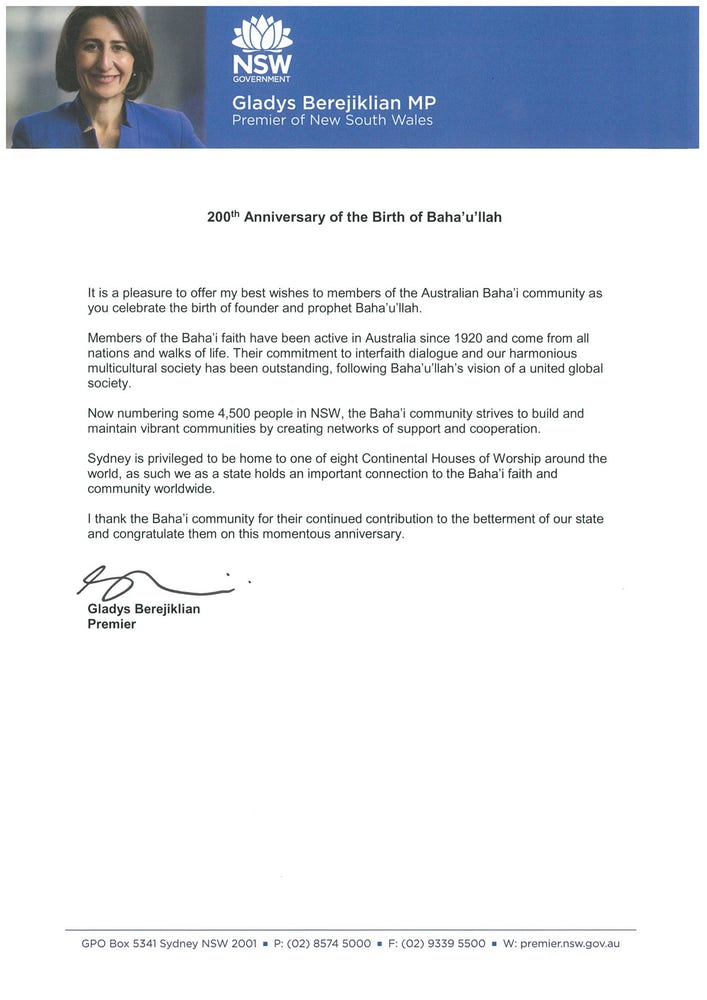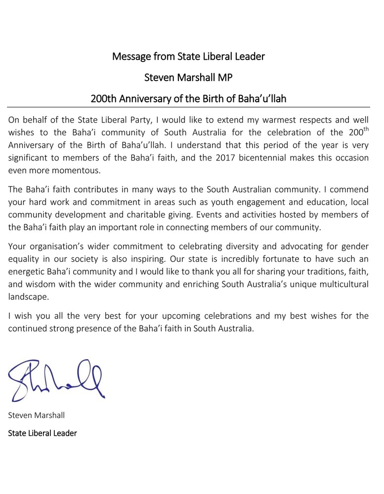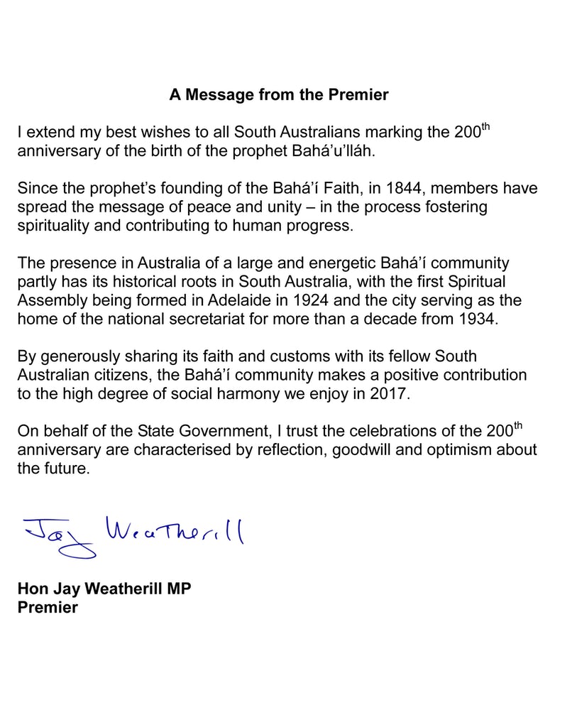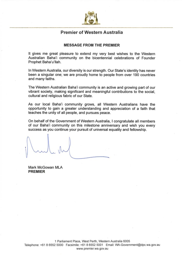 Mark McGowan, Premier ministre d’Australie-Occidentale, a exprimé des sentiments similaires, en écrivant : « La communauté bahá’íe d’Australie-Occidentale est une composante active et croissante de notre société dynamique, apportant une contribution importante au tissu social, culturel et religieux de notre état. »