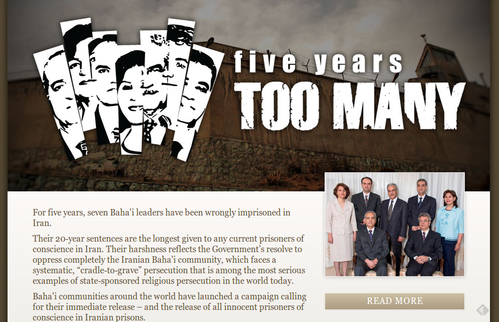 Die Kampagne mit dem Titel „Fünf Jahre zu viel“ dauert vom 5. bis zum 15. Mai. Rund um die Welt bereiten sich derzeit Bahá’í-Gemeinden und andere Einrichtungen darauf vor, in öffentlichen Veranstaltungen über das Leid der sieben Bahá’í zu informieren, die fünfzehn weitere Jahre in Haft verbringen sollen. Ihre zwanzigjährige Haft ist die derzeit längste Strafe, die politische Gefangene im Iran verbüßen.\n\nIn vielen Städten weltweit, unter anderem in Paris, Berlin, London, Sydney, Washington D.C. und Neu Delhi, finden Veranstaltungen statt, in denen die sofortige Freilassung dieser sieben Führungsmitglieder verlangt wird.