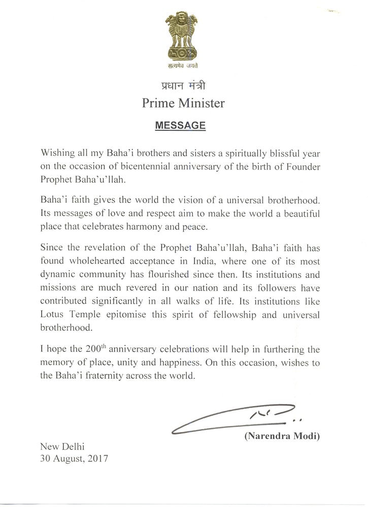 “Baha’i Faith gives the world a vision of universal brotherhood,” wrote Prime Minister Modi in his letter to the Baha’i community of India. “Its messages of love and respect aim to make the world a beautiful place that celebrates harmony and peace.”