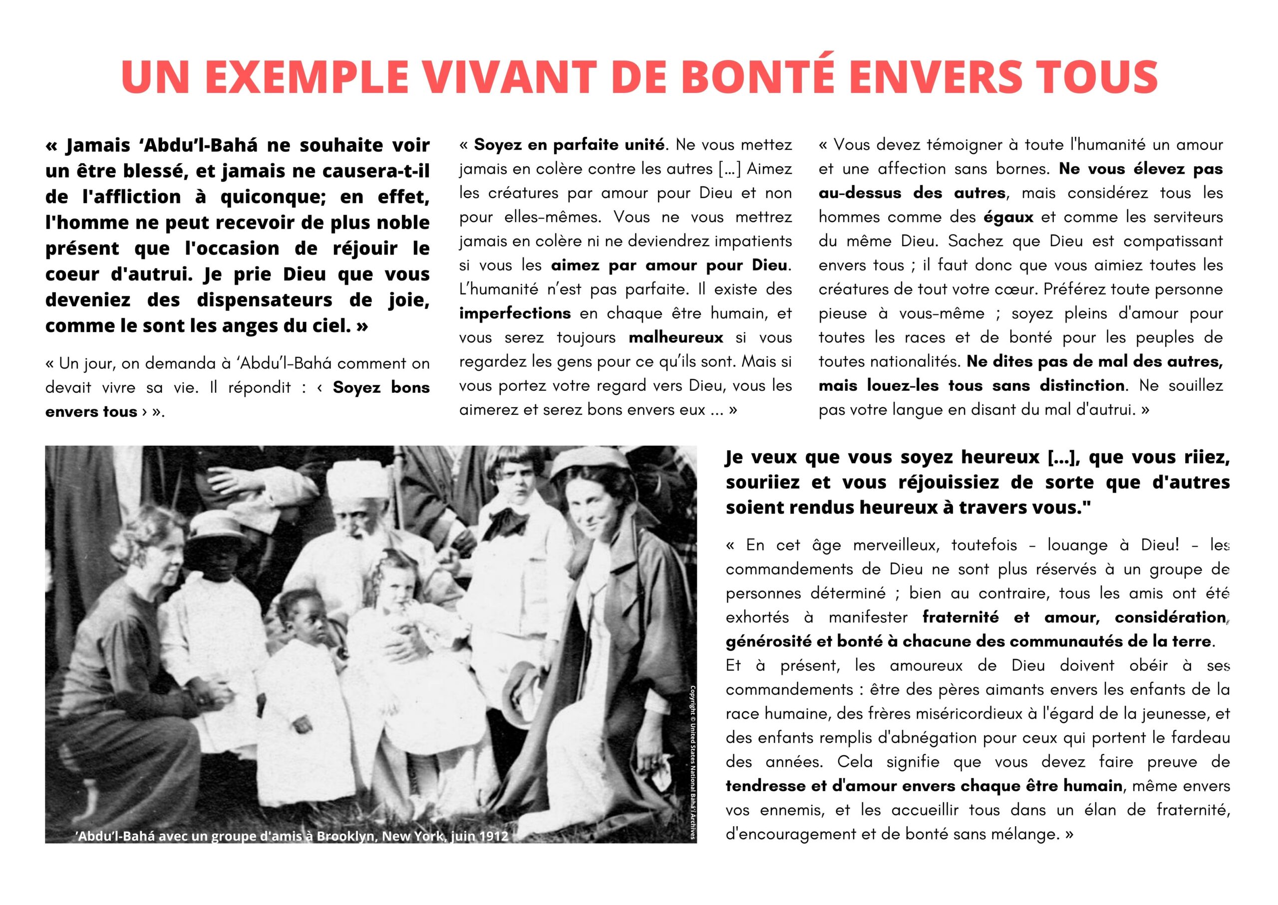 « Un jour, on demanda à ‘Abdu’l-Bahá comment on devait vivre sa vie. Il répondit : ‹ Soyez bons envers tous › ».