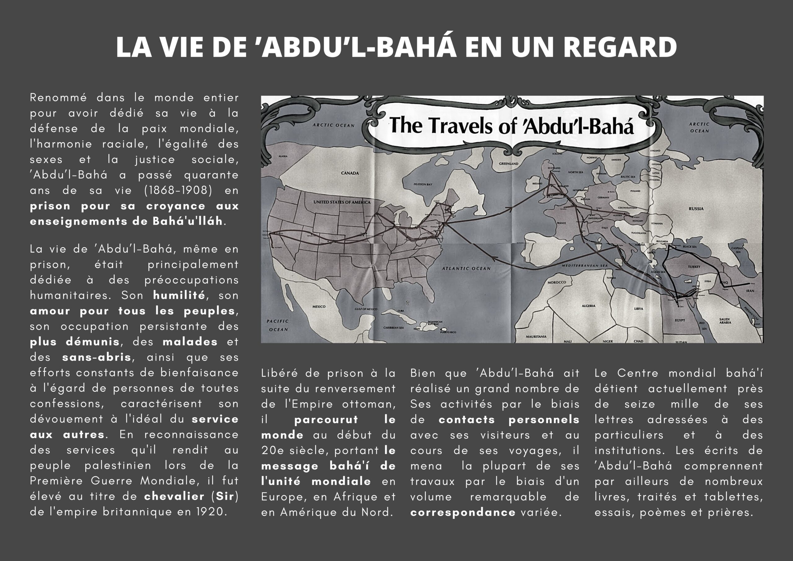 Renommé dans le monde entier pour avoir dédié sa vie à la défense de la paix mondiale, l'harmonie raciale, l'égalité des sexes et la justice sociale, ’Abdu’l-Bahá a passé quarante ans de sa vie (1868-1908) en prison pour sa croyance aux enseignements de Bahá'u'lláh.