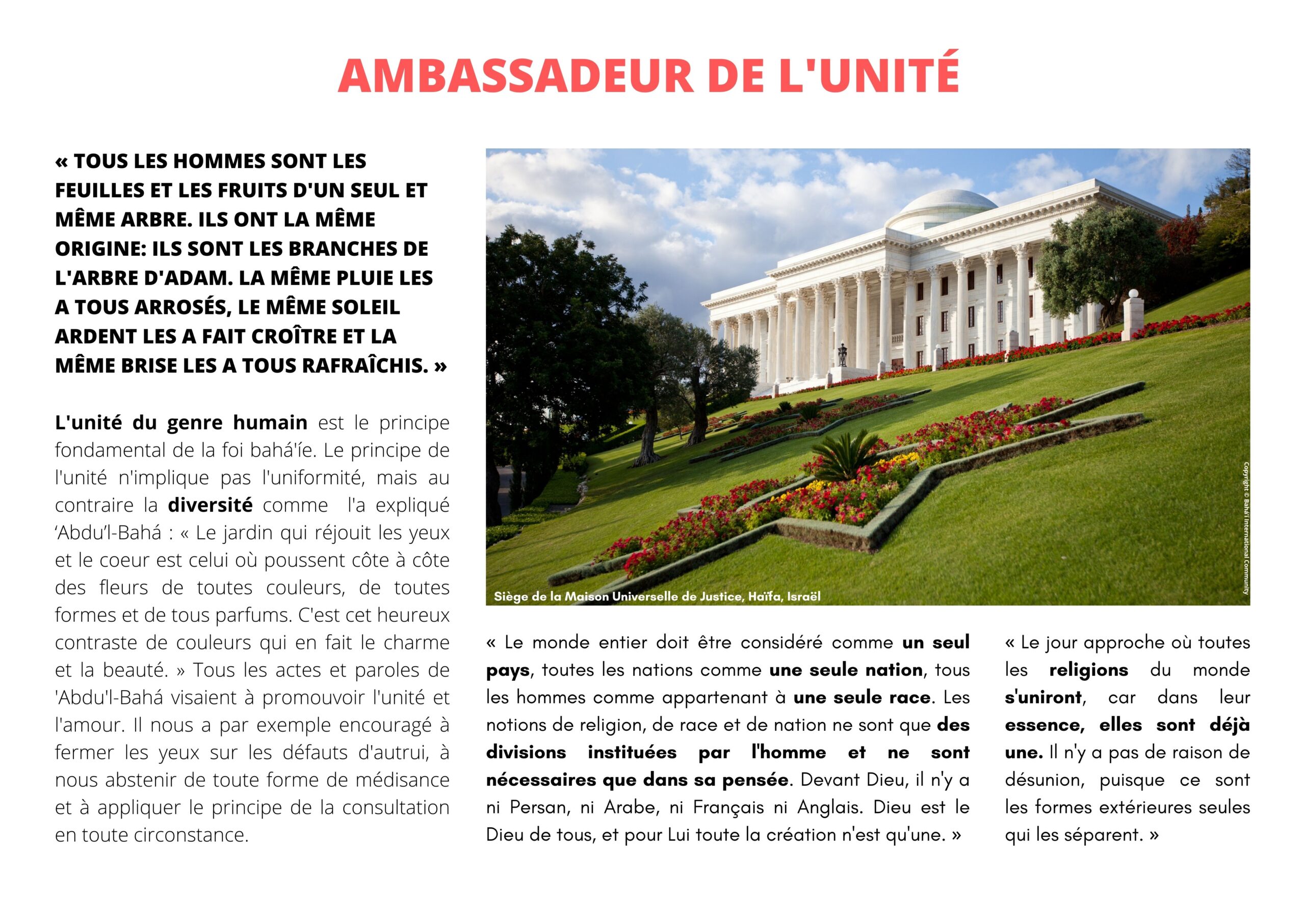 L'unité du genre humain est le principe fondamental de la foi bahá'íe. Le principe de l'unité n'implique pas l'uniformité, mais au contraire la diversité comme l'a expliqué ‘Abdu’l-Bahá : « Le jardin qui réjouit les yeux et le coeur est celui où poussent côte à côte des fleurs de toutes couleurs, de toutes formes et de tous parfums. C'est cet heureux contraste de couleurs qui en fait le charme et la beauté. » Tous les actes et paroles de 'Abdu'l-Bahá visaient à promouvoir l'unité et l'amour. Il nous a par exemple encouragé à fermer les yeux sur les défauts d'autrui, à nous abstenir de toute forme de médisance et à appliquer le principe de la consultation en toute circonstance.