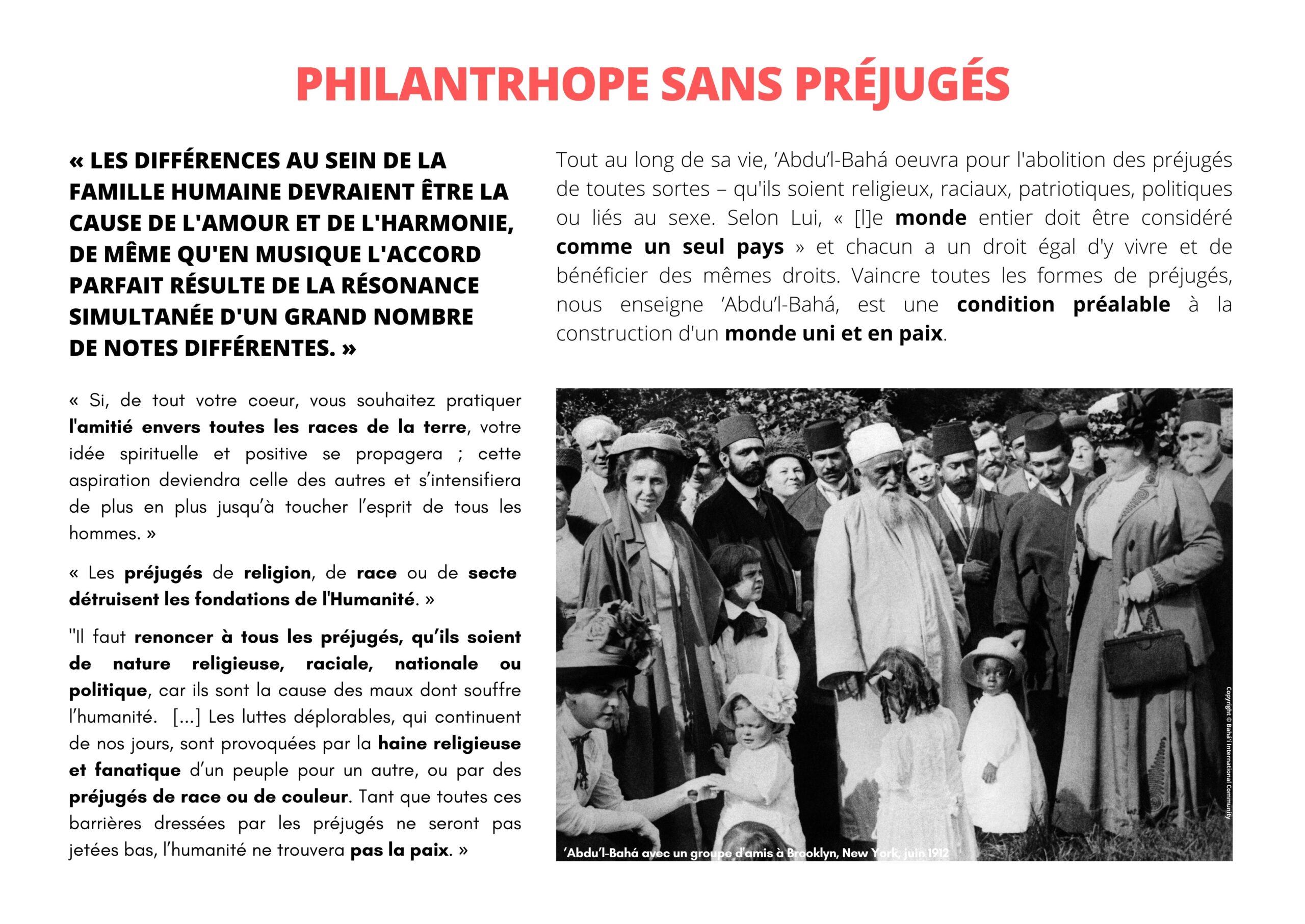 Tout au long de sa vie, ’Abdu’l-Bahá oeuvra pour l'abolition des préjugés de toutes sortes – qu'ils soient religieux, raciaux, patriotiques, politiques ou liés au sexe. Selon Lui, « [l]e monde entier doit être considéré comme un seul pays » et chacun a un droit égal d'y vivre et de bénéficier des mêmes droits. Vaincre toutes les formes de préjugés, nous enseigne ’Abdu’l-Bahá, est une condition préalable à la construction d'un monde uni et en paix.
