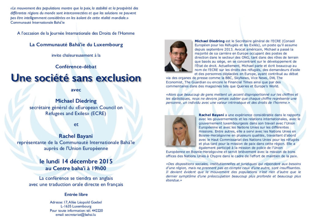 LUXEMBOURG, publié le 22 décembre 2015 – Cette année la conférence organisée par la Communauté Baha’ie du Luxembourg le 14 décembre à l’occasion de la Journée internationale des Droits de l’Homme portait sur la situation des réfugiés en Europe. Les intervenants étaient : Michael Diedring, Secrétaire Général de l’ECRE (Conseil Européen pour les Réfugiés et les Exilés) et Rachel Bayani, Représentante de la Communauté Internationale Baha’ie auprès de l’Union Européenne.
